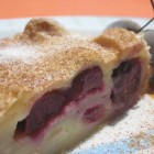 400 gr de hojaldre fresco, 300 gr de cerezas, 300 ml de leche, 90 gr de azúcar, 30 gr de harina, 3 yemas, vainillina, 1 limón, azúcar glas y canela.