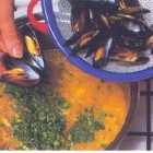 Lave y raspe los mejillones, y deseche aquellos que no se cierren al darles un golpe suave con un cuchillo.